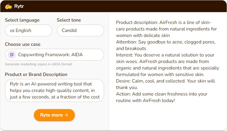 Use Rytr’s AI copywriting software to generate creative & catchy copies in AIDA format for your product, service, company, or brand